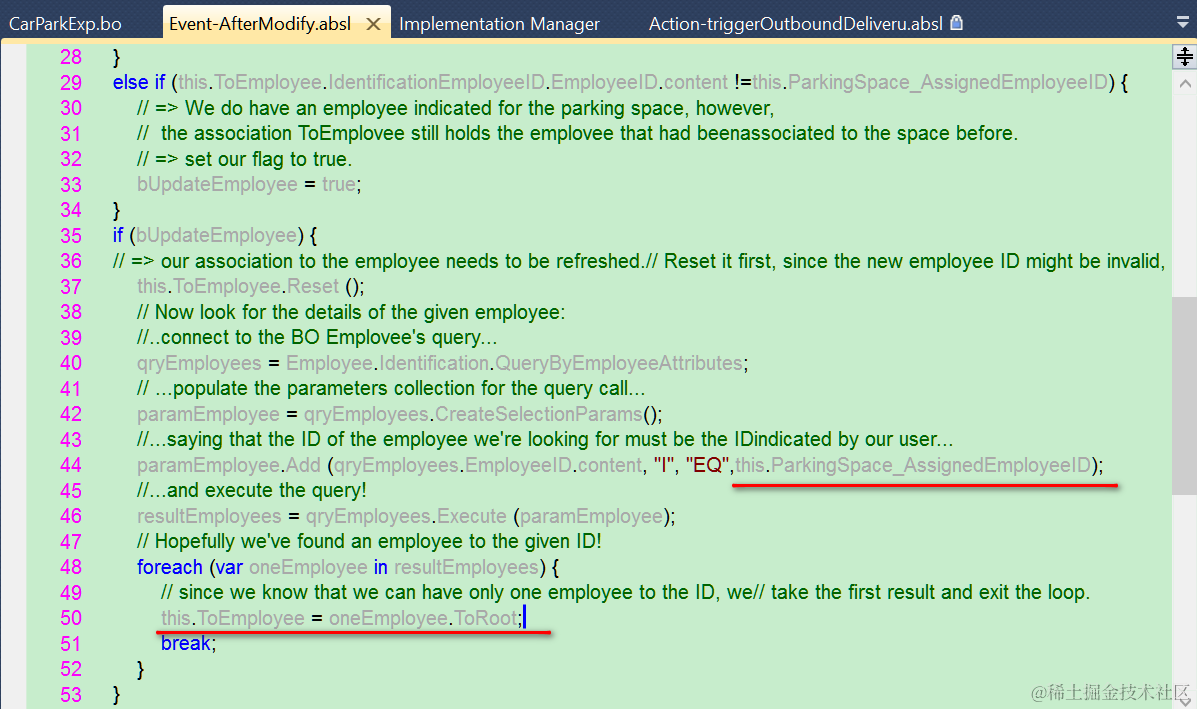 ABSL实现最核心的逻辑就是,将用户输入的employee ID作为输入参数,调用employee BO提供的QueryByEmployeeAttributes,去Cloud for Customer数据库查询Employee实例数据,并将其Root节点返回给自定义BO的toEmployee association.