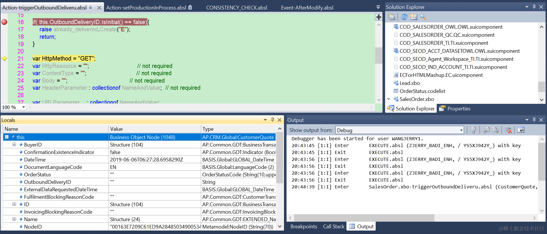 之后,一旦使用该user在UI上操作,只要该UI操作会触发我们设置断点的ABAP script 文件的执行,则断点会自动触发: