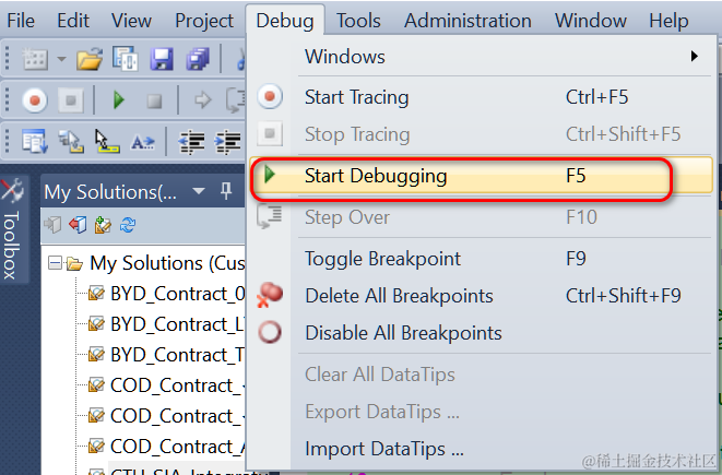 使用菜单Debug->Start Debugging,切换成调试模式: