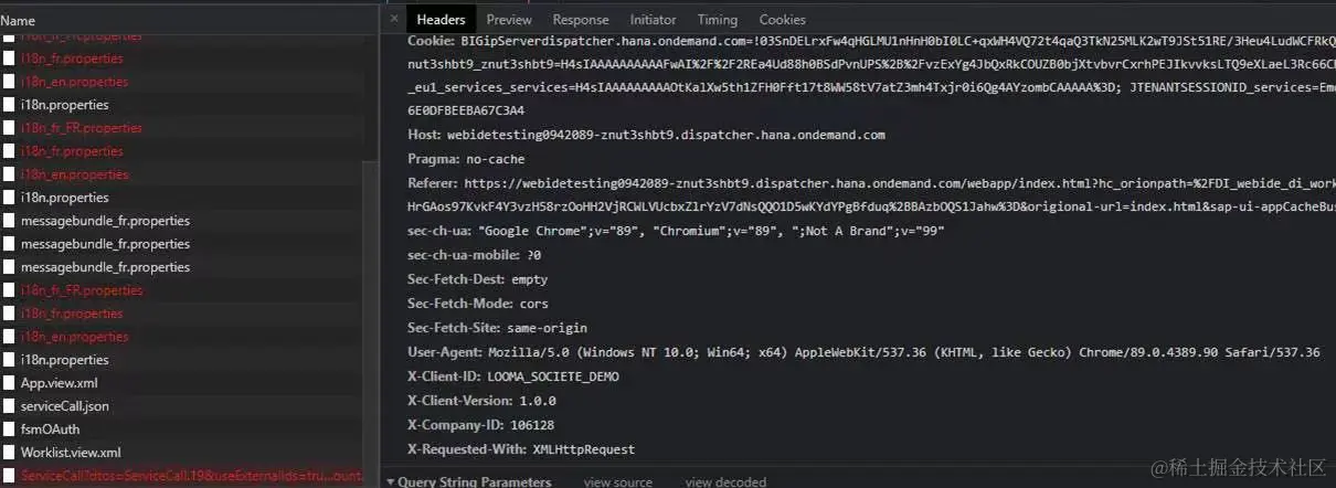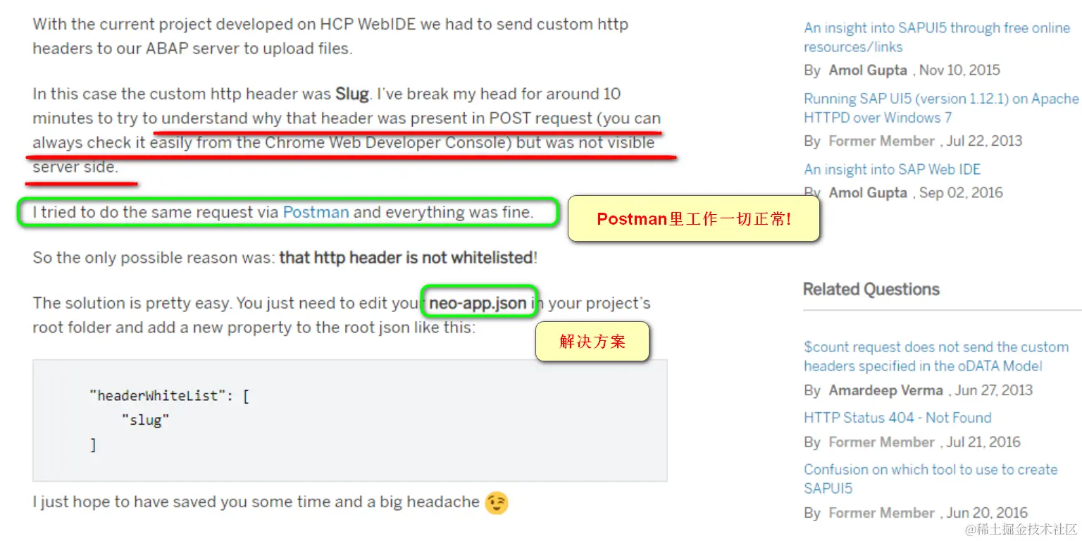 在SAP 社区上也有朋友在2016年时遇到类似问题,最后发现自己部署到 SAP 云平台的 SAP UI5 应用,发送出去的 HTTP 请求头部自定义字段,因为没有定义在neo-app.json的白名单及headerWhiteList里,因此没有真正发送到服务器端: