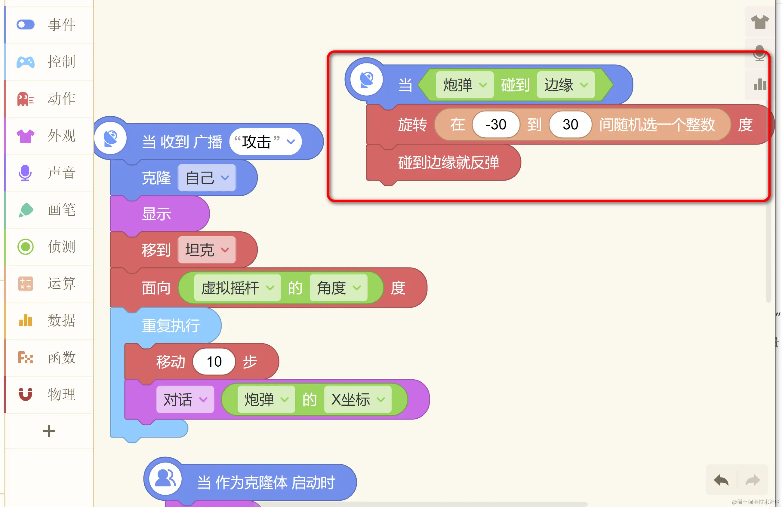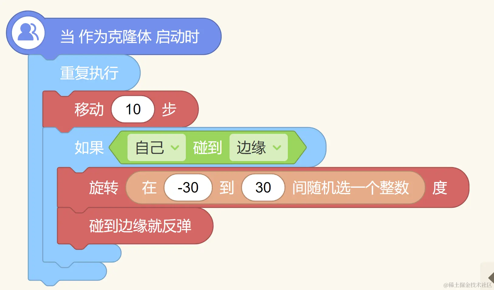 如果把“碰到边缘就反弹” 放到重复执行内,则序号为2,即 “当自己碰到边缘” 的事件,永远无法发生。