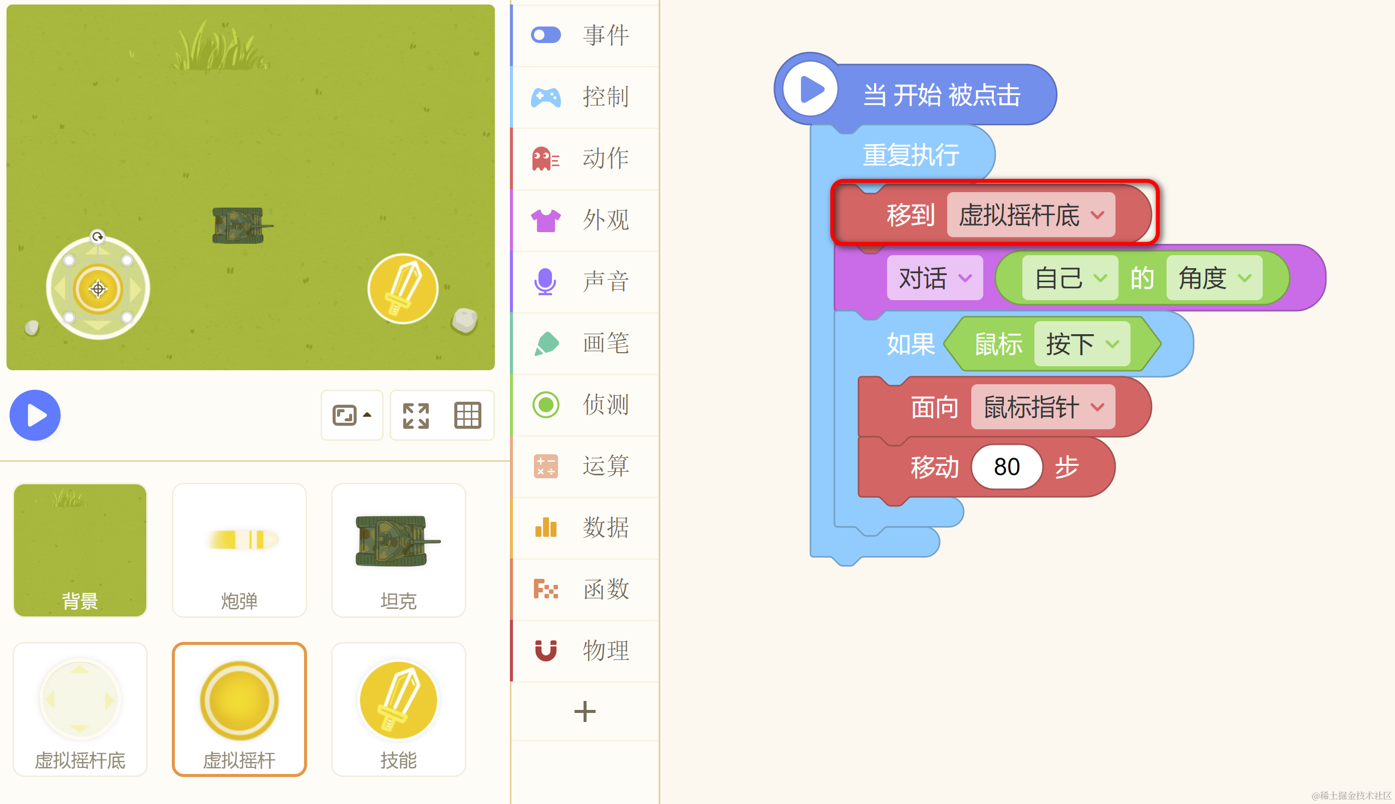 - 所谓移动到虚拟摇杆底,意思是虚拟摇杆和虚拟摇杆底二者的中心点在任意时刻都重合,因为这个积木是被重复执行积木包裹的。