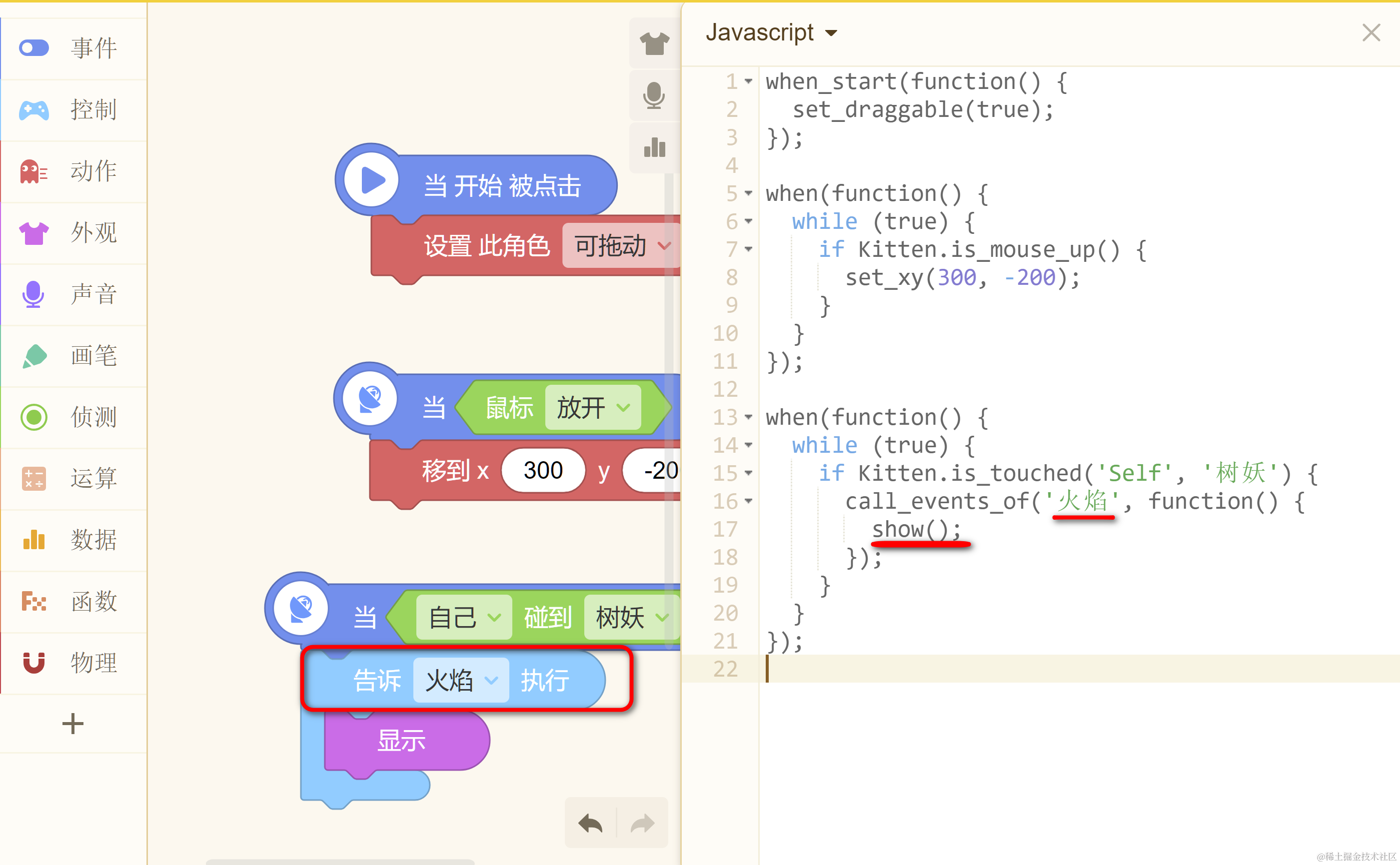 物体A 可以让物体B执行某操作,通过积木 “告诉” X 执行 Y 完成。