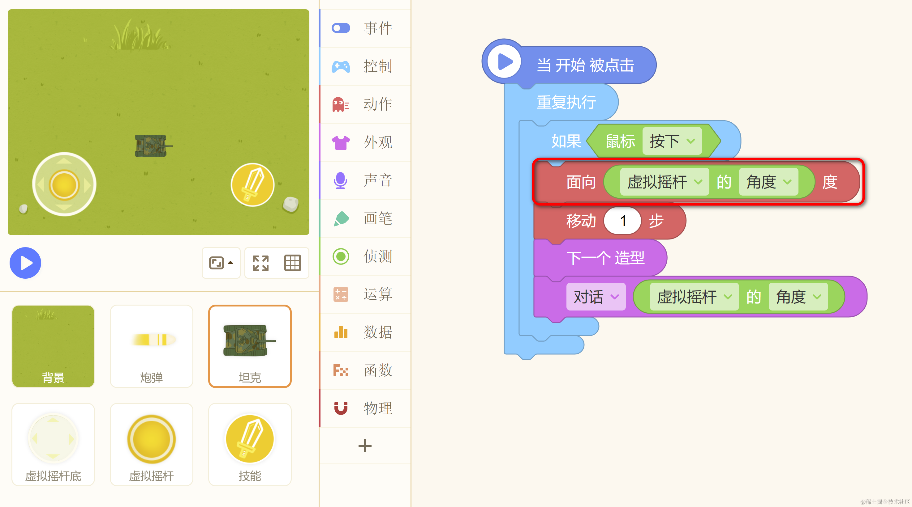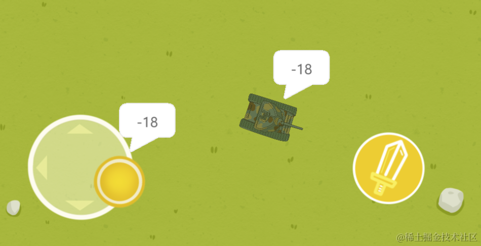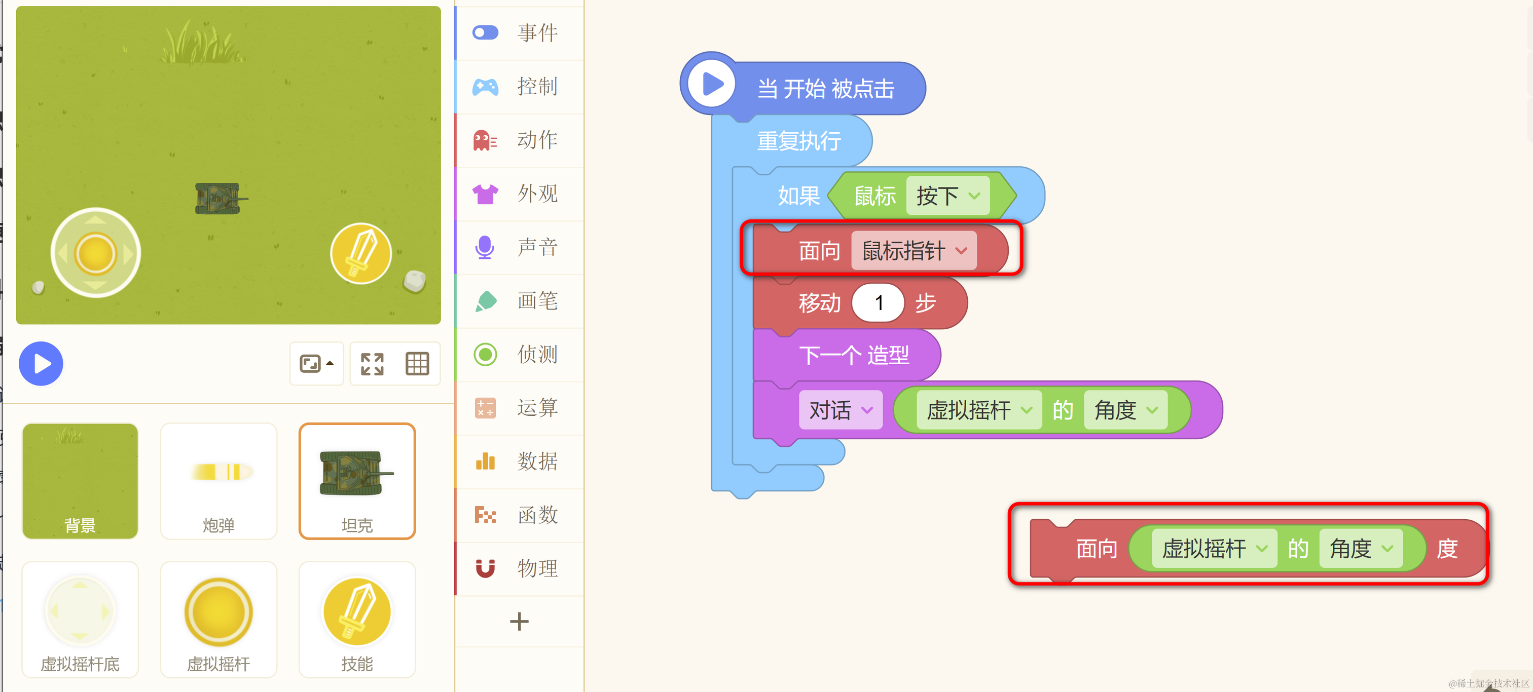 - 坦克移动的方向是朝着面向虚拟摇杆的角度。这个设置很巧妙,如果改成面向鼠标,
