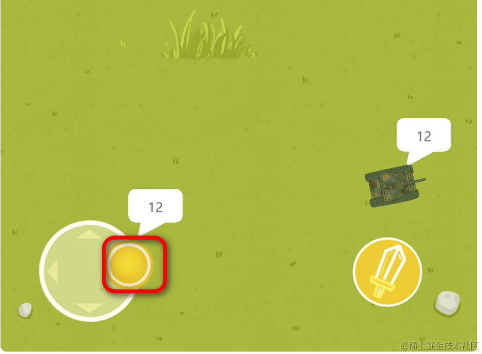 所谓虚拟手柄,指的是我们可以通过按住鼠标不放,移动下图黄色圆圈,坦克即可朝着手柄移动的方向前进。