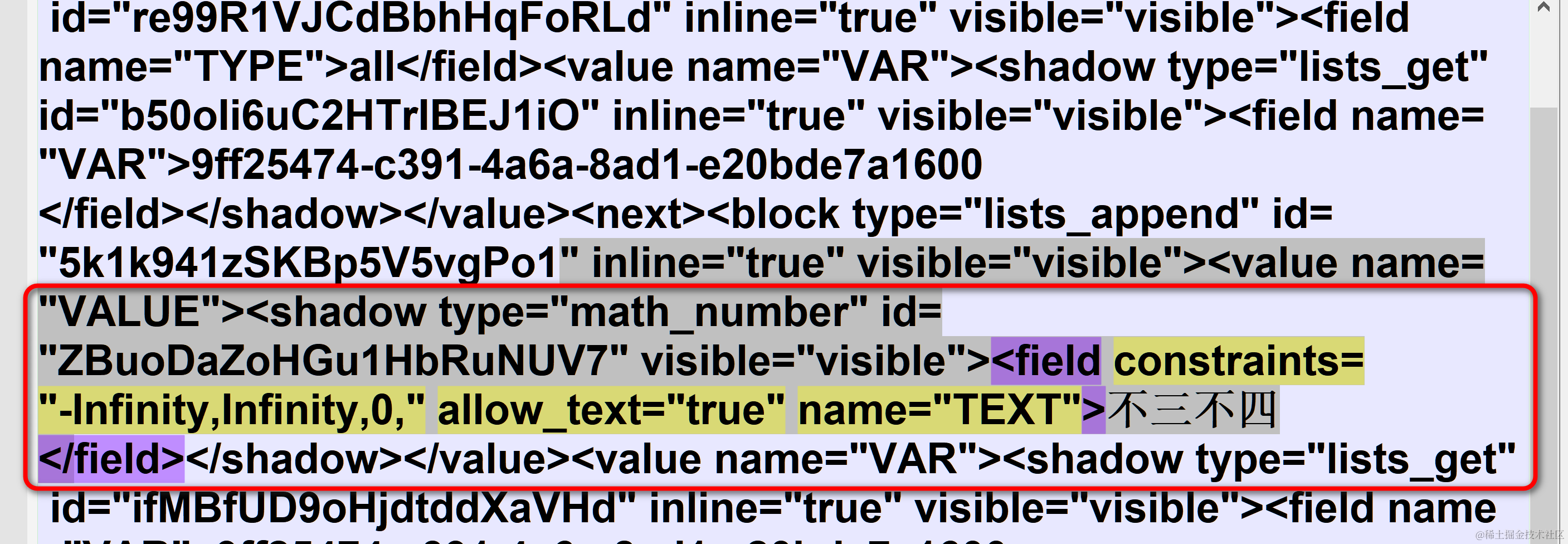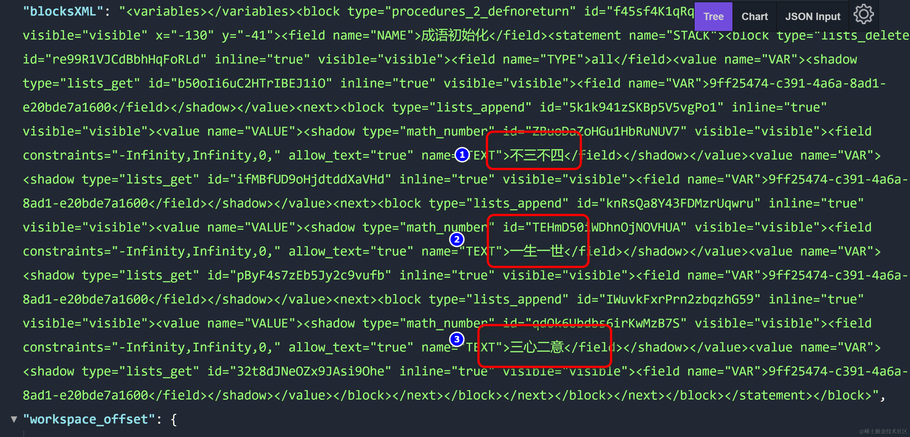 每个在函数实现里插入到列表中的硬编码的成语字符串,在 kitten 编程猫 项目工程源代码里,都是类型为shadow的 xml 节点,包含有20位guid,自己用其他的程序不易自动创建这些xml片段。