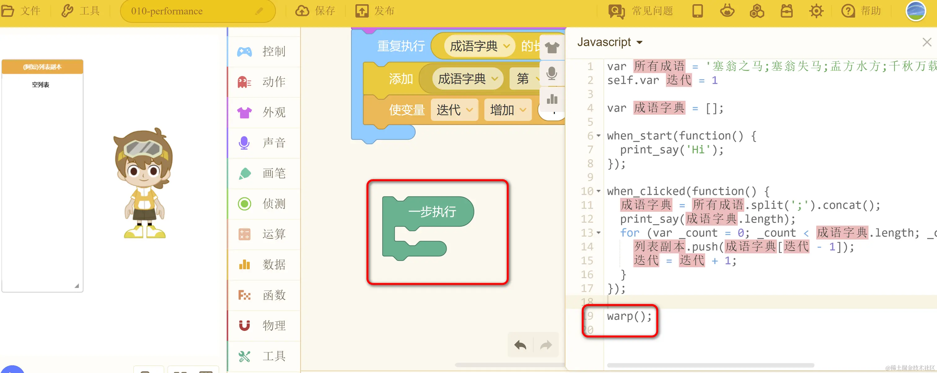 Kitten编程猫 里的一步积木设计原理 已注销 2021-04-26 569 阅读1分钟 一步积木位于 kitten编程猫 里的“积木实验室-扩展积木”: 这个wrap有什么奥妙,只有查看 kitten编程猫 的源代码了: 按照 Kitten编程猫 的帮助文档,一步执行积木在操作大数据场景中非常有用: 在我们进行大数据运行时,对比会更明显。 同样让一个变量重复增加 2000 次 普通执行情况下,需要等变量从 1 慢慢增加直到 2000,需要较长的一段时间。 加上“一步执行”后,程序直接运行结果,显示 2000 次。 更多Jerry的原创文章,尽在:“汪子熙”: