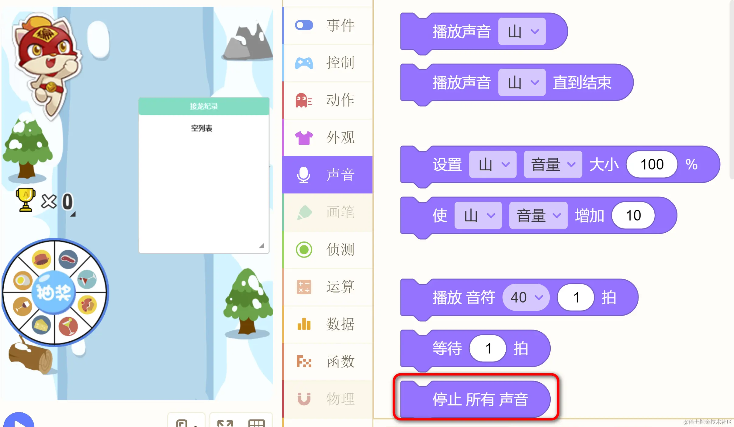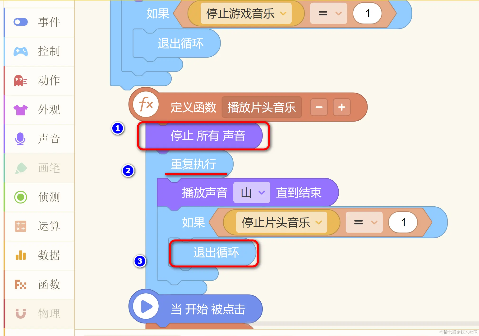 这样,在执行“停止所有声音” 积木时,在“重复执行” 积木里执行的 “播放 XX 声音直到结束” 就会返回,然后进入 IF 积木,此时即可有机会退出“重复执行” 积木,从而切换到其他音乐的播放。