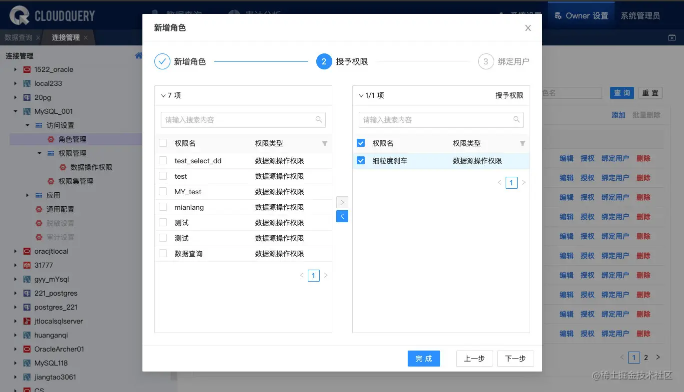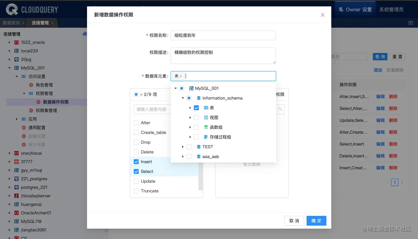 例如上图中,分配给某用户的 MySQL_001 连接中 infromation_schema 数据库中查看和插入表的权限,如果想要收回,一键点击即可。