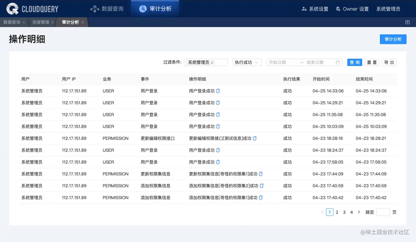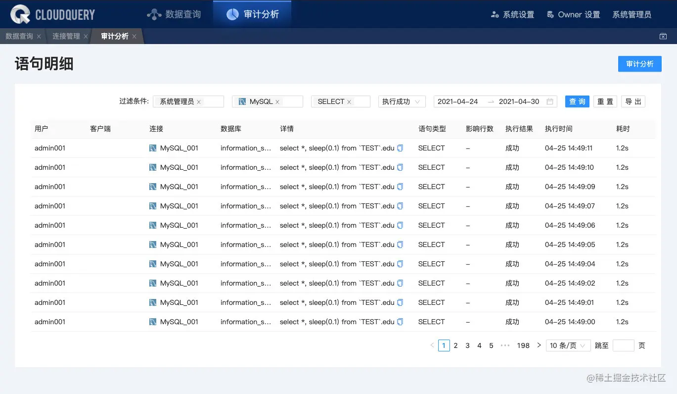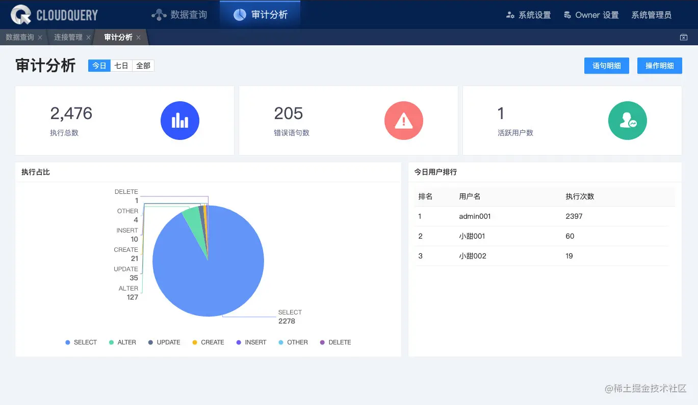 所有的用户在 CloudQuery 系统内所执行的所有 SQL 语句将会都被记录。管理员可以在审计分析界面随时查看用户所执行的语句和操作。