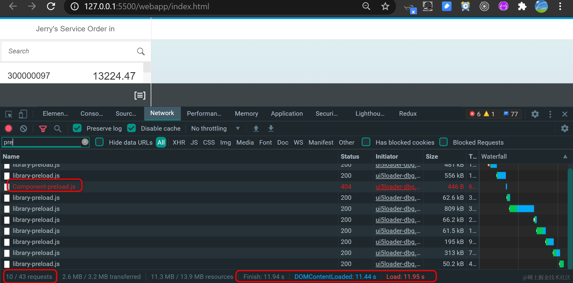 在SAP UI5项目文件里缺少Component-preload.js时,我的UI5脚手架应用,总共发起了43个网络请求,页面加载时间为 11.95秒: