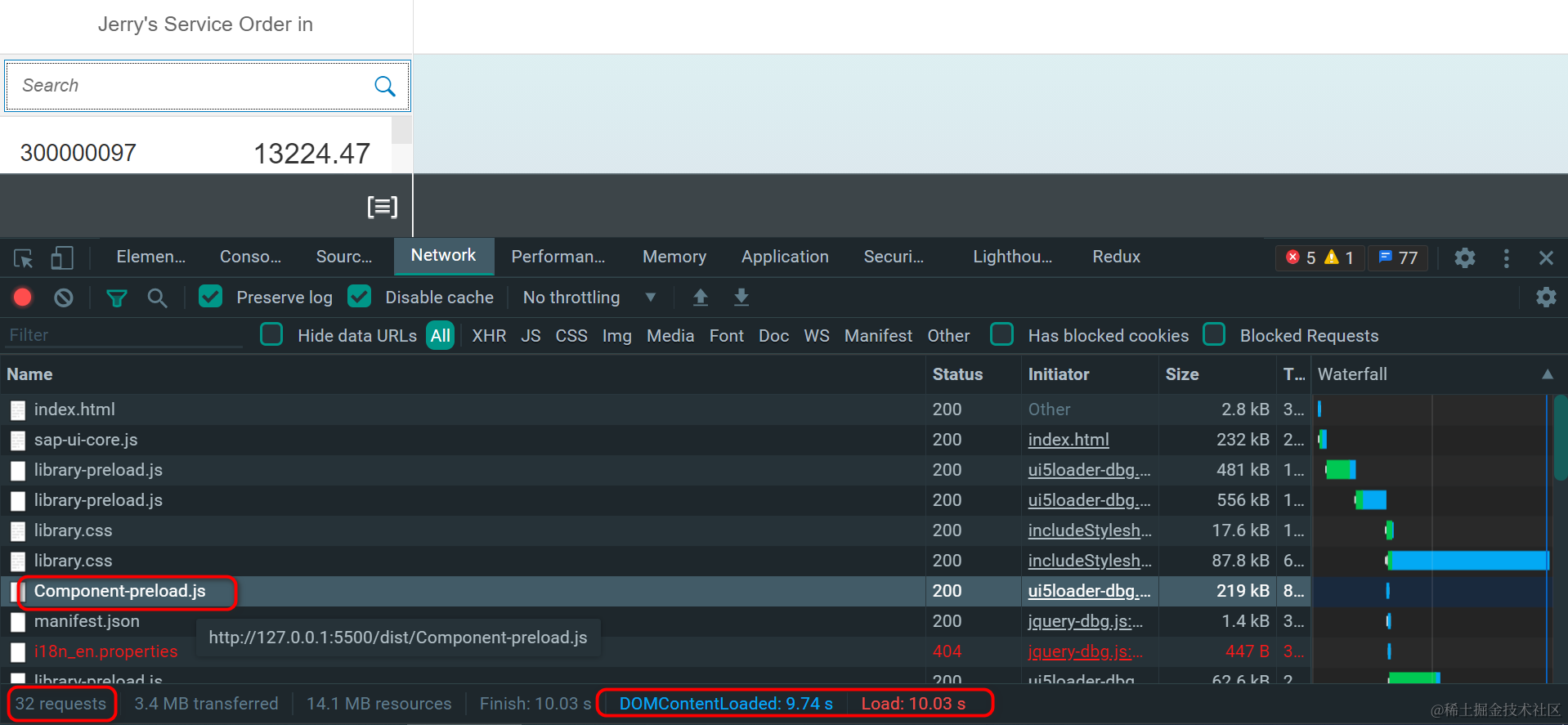 而通过 SAP UI5 打包工具生成Component-preload.js后,加载该应用一共用了32个网络请求,减少了11个请求,页面加载时间减少到10秒。