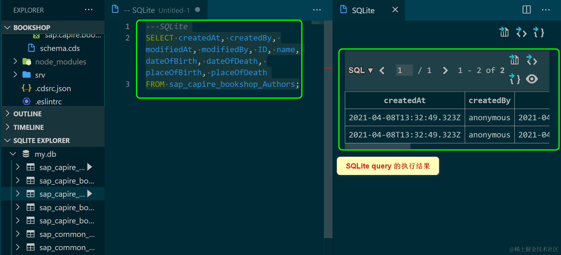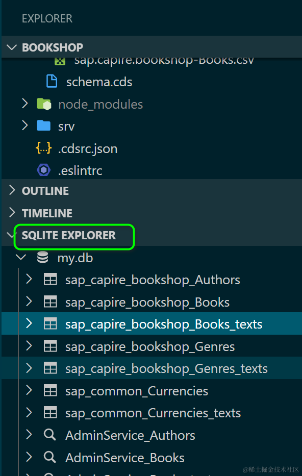 安装完毕后,能在 Visual Studio Code 左边看到一个新的 SQLITE EXPLORER面板,里面可以浏览 my.db 文件里包含的数据库表和视图: