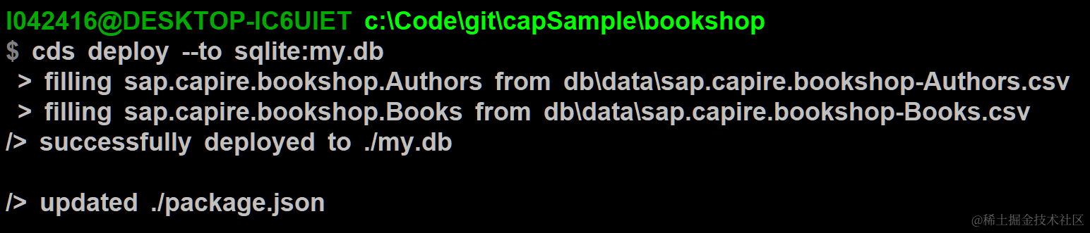 在 SAP Cloud Application Programming 编程模型里,我们可以使用下面的命令行,使用持久化数据库( persistent database ) 来存储 entity 的数据。
