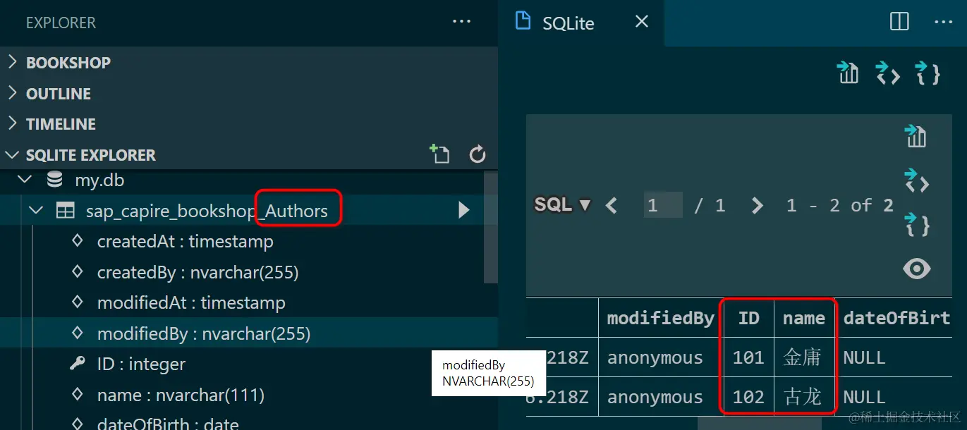 注意,SAP Cloud Application Programming 的 .cds schema文件里用 entity 定义的模型的字段,和对应的持久化数据库表的字段名称,并不一定总是完全相同。