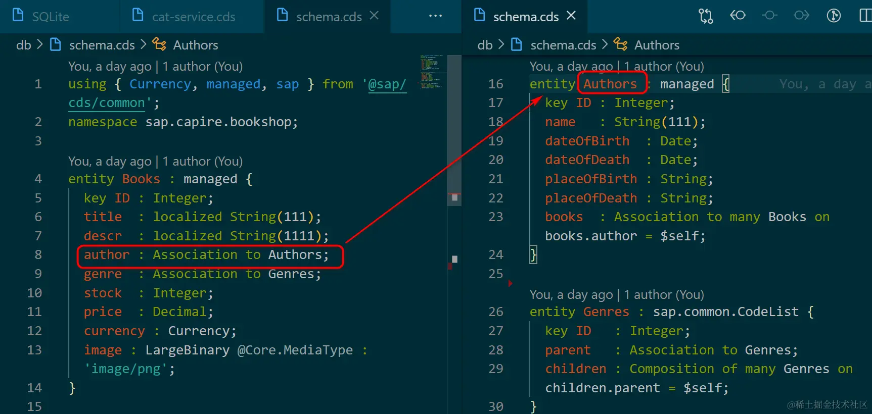 我定义了两个业务模型,名称分别为 Books 和 Authors, 其中 Books 模型有一个名为 author 的字段,该字段通过 Association, 关联到 Authors 模型。因为这里使用的是 Association to,而非 Association to many,所以语义上表达的是一本书有且仅有一位作者。