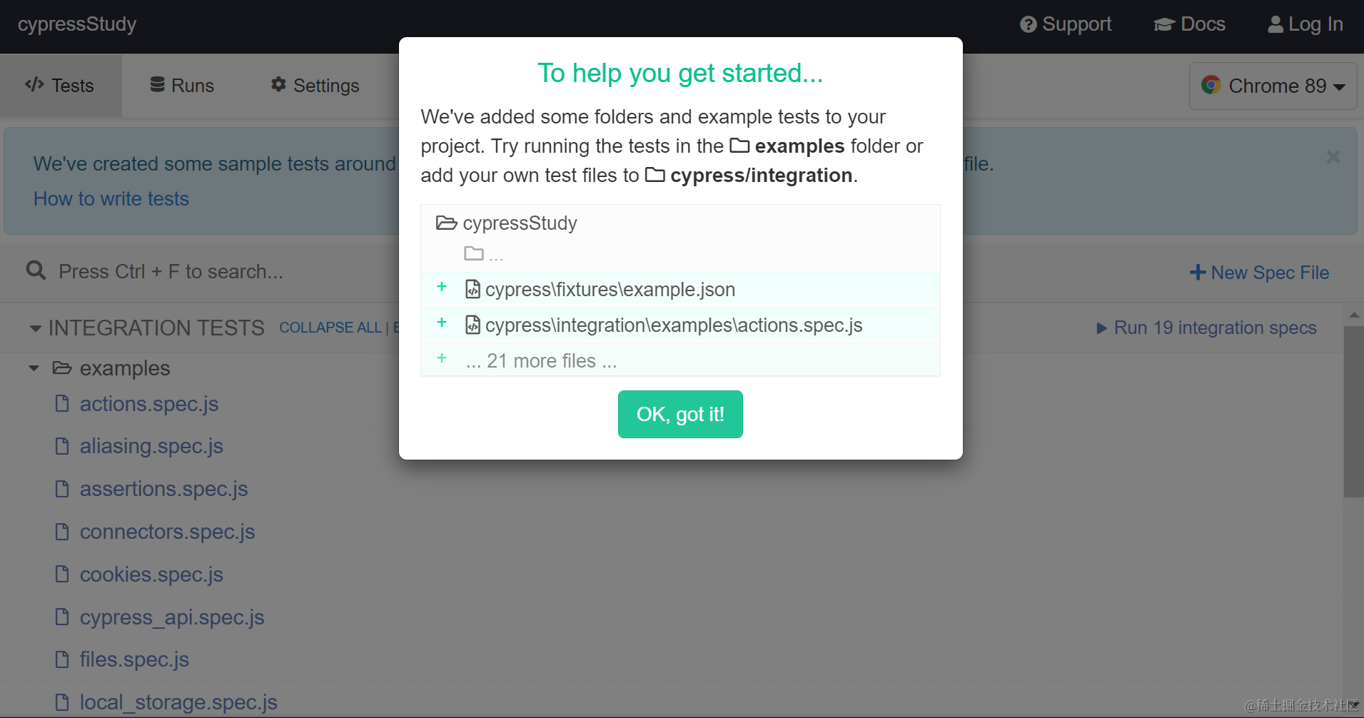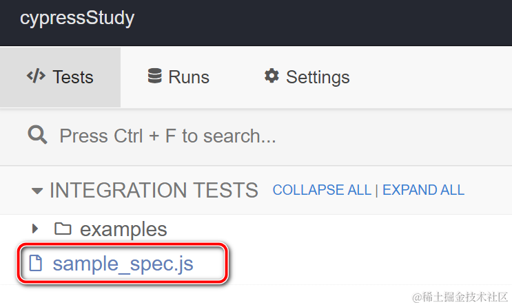 然后执行命令 npm run open, 即可打开 Cypress test runner: