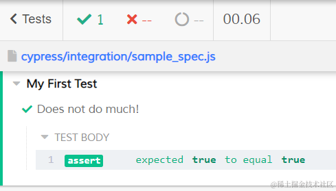 点击 Test Runner 里的 sample_spec.js 超链接,看到期望的执行结果:assertion 通过。