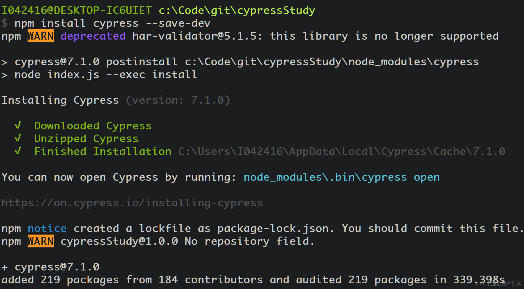 命令行安装 Cypress: