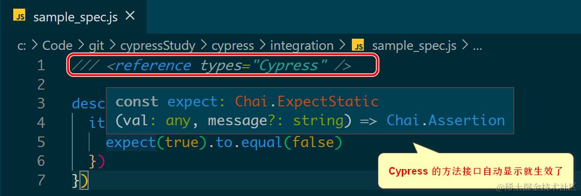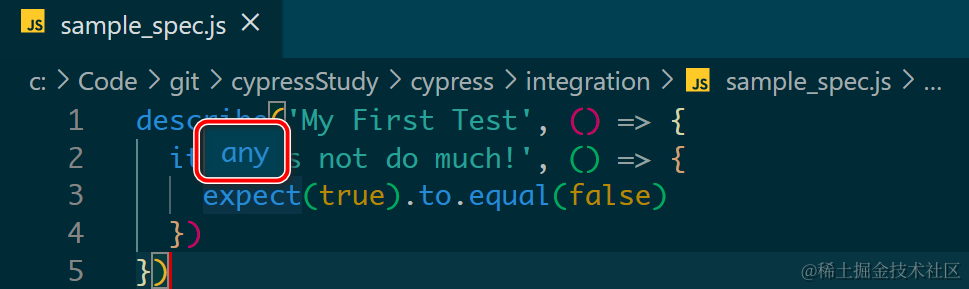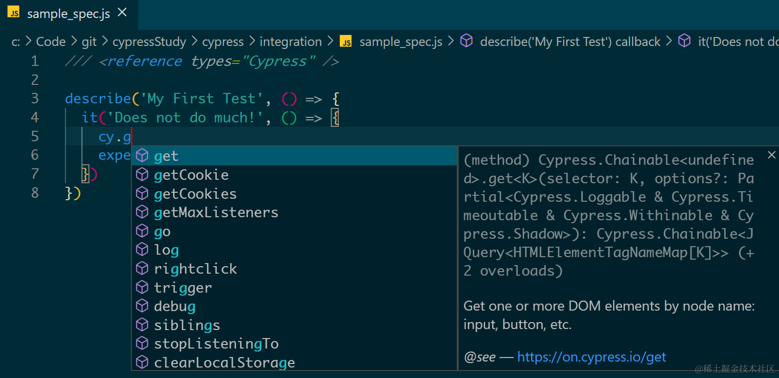 如何让 Visual Studio Code 里显示 Cypress 的 intelligent code suggestion 已注销 2021-04-26 275 阅读1分钟 如下图所示,把鼠标 hover 在 Visual Studio Code 里打开的 Cypress 代码时: 只会显示 “any”的 popover 对话框出来: 在文件头加上下列这段注释之后: /// <reference types="Cypress" /> 代码自动补全也生效了: 更多Jerry的原创文章,尽在:“汪子熙”: