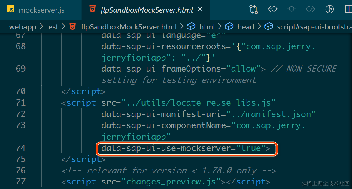 这个 script data-sap-ui-use-mockserver 标签里,定义了 为 true: