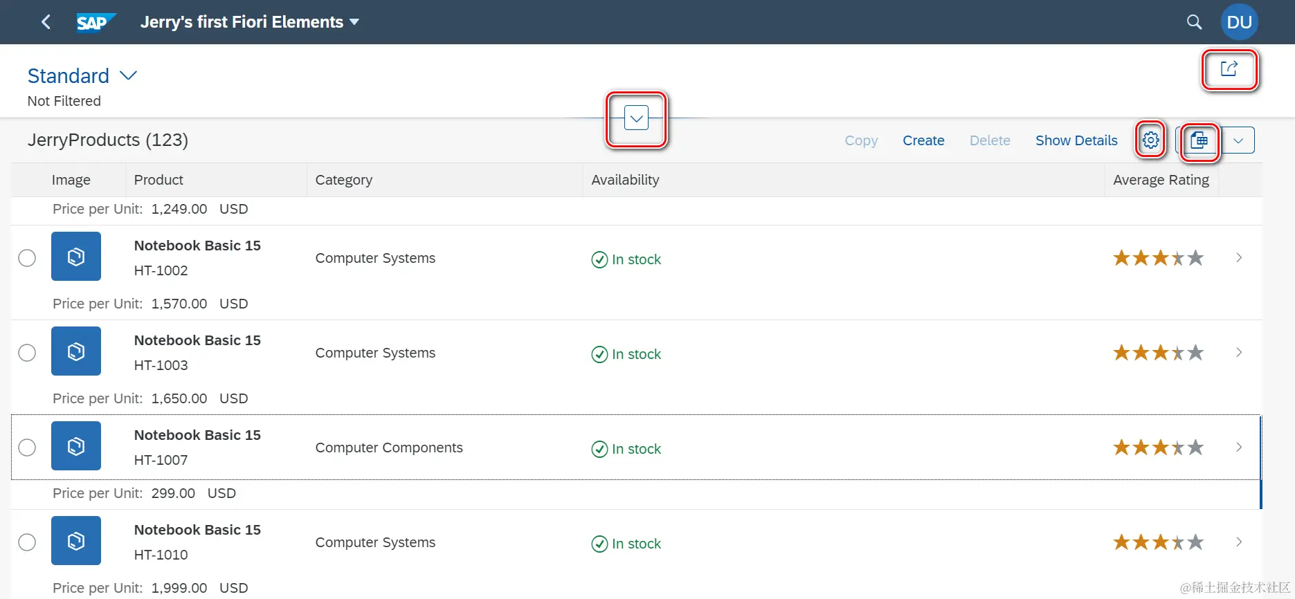 以下图为例,该应用通过 SAP Fiori Elements 开发而成,图中高亮的几个图标,是 SAP Fiori Elements List Report 模板内定义的标准图标,并没有包含在应用开发人员通过 Application Generator 创建出来的本地工程文件里。因此这些图标对应的 sap-icon:// , 根本无法通过本地工程源代码搜索的方式获得。