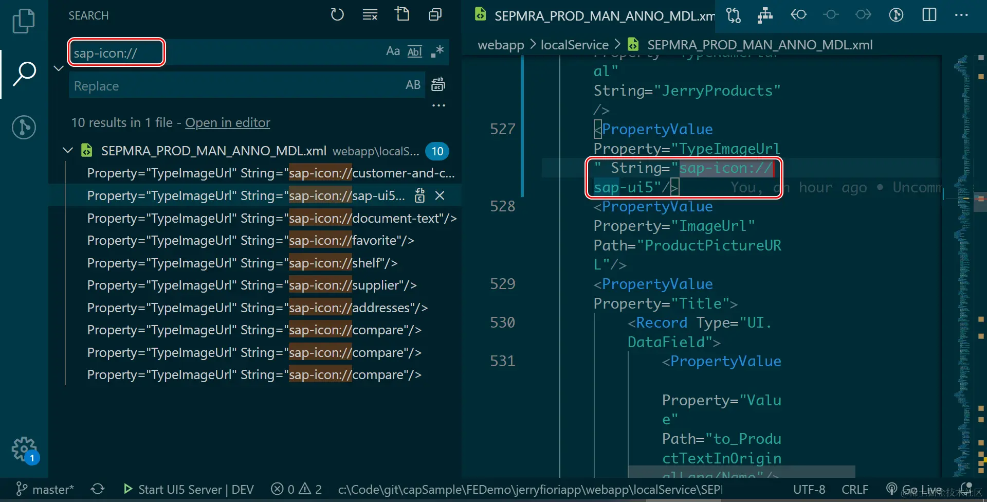 使用 Visual Studio Code 等编辑器打开 SAP Fiori 应用的源代码,搜索关键字 sap-icon://, 则编辑器会列出该 Fiori 应用使用到的所有图标的 sap-icon:// 值。