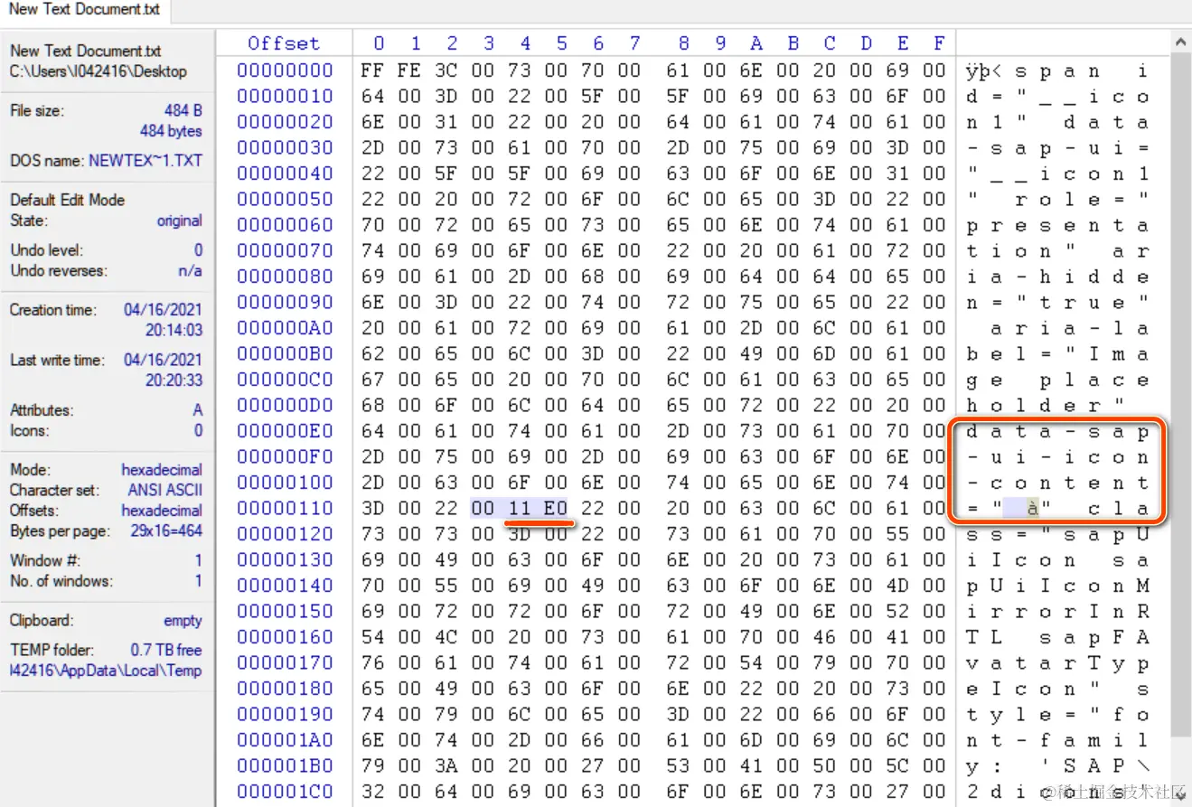 用 UltraEdit 或者 WinHex 之类的工具软件,打开以 UTF-16 另存的记事本文件。找到之前在浏览器和记事本里,均无法正常显示的 data-sap-ui-icon-content 属性值,其 Unicode 为 E011.