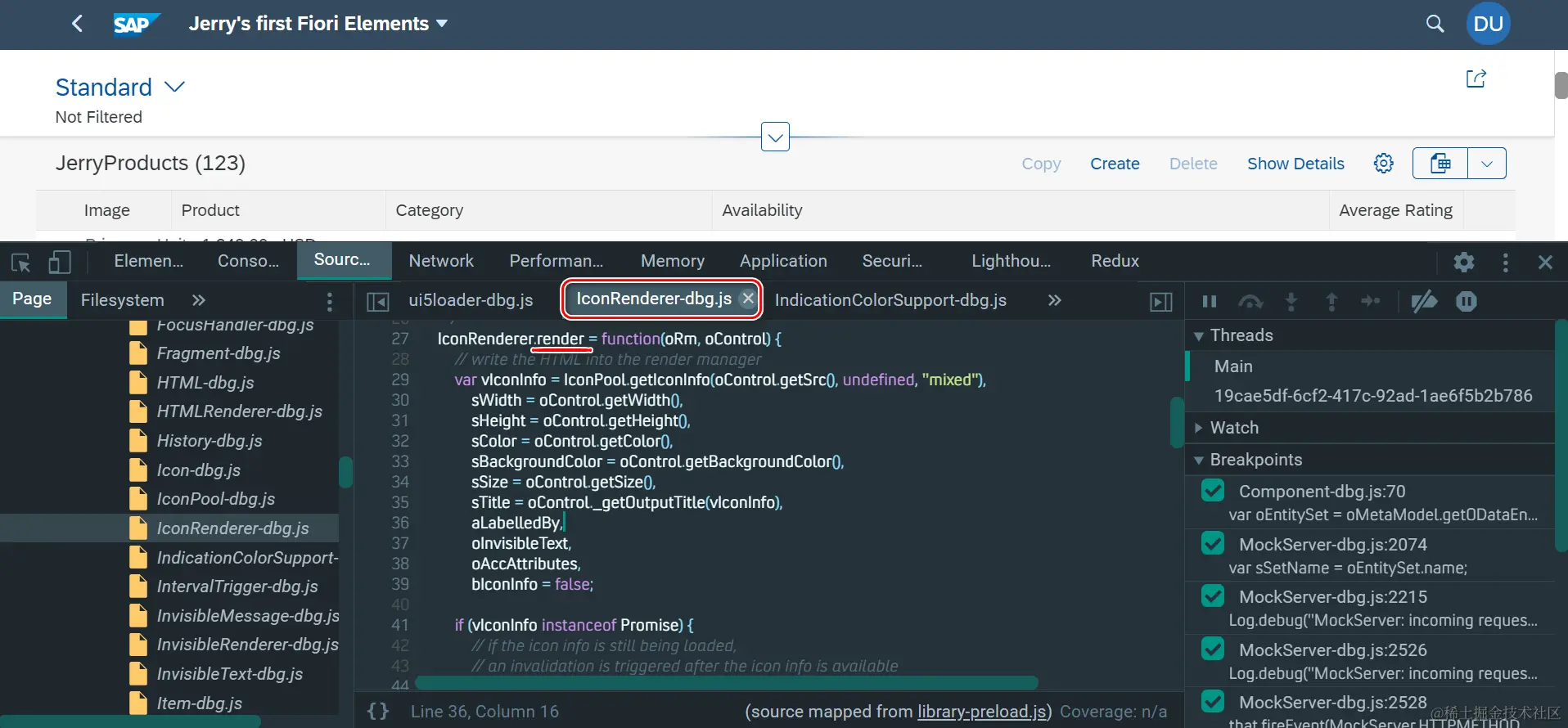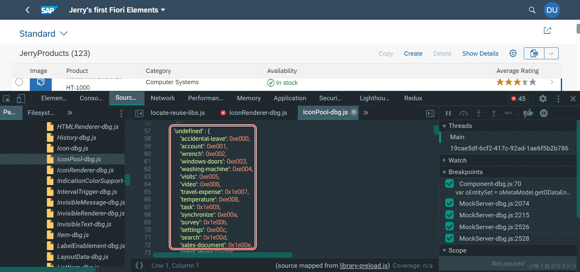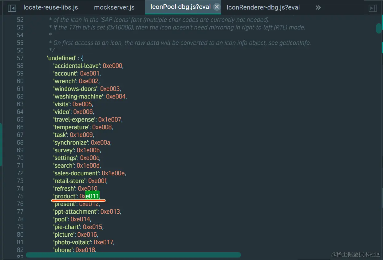 运行时断点触发,第61行变量 vIconInfo里包含的 uri 字段的值,即是我们要找的 sap-icon://product.