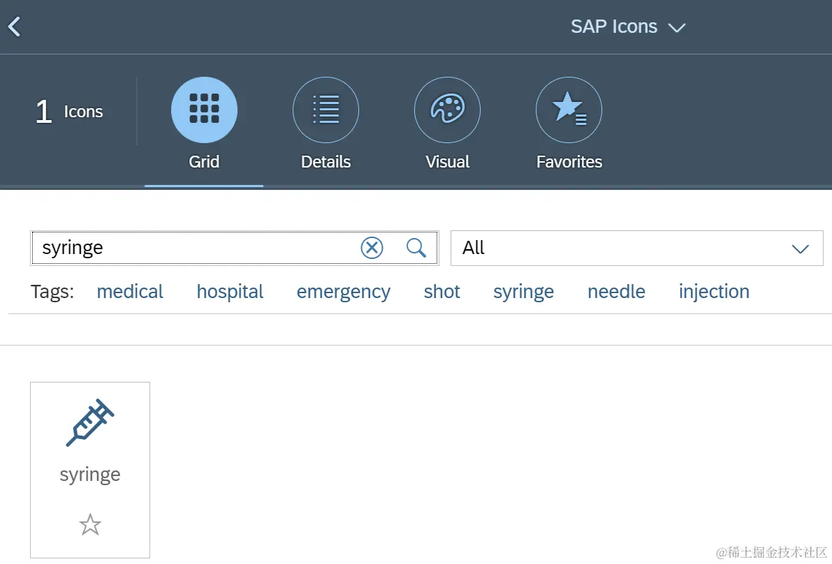 比如 sap-icon://syringe 对应下图这个注射器图标。至于运行时,Icon 控件 src 属性值对应的图案是如何被渲染出来的,该技术细节由 SAP UI5 框架去实现,一般的 SAP UI5 应用开发人员无需了解。