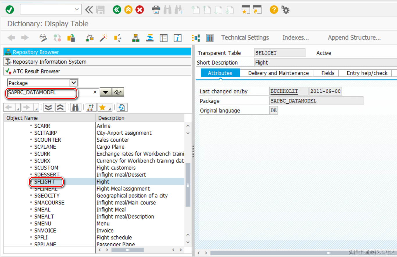 SAPBC_DATAMODEL 开发包下,包含了 SFLIGHT, SPFLI 等一系列 ABAP 数据库表,能帮助大家学习 ABAP 这门编程语言。