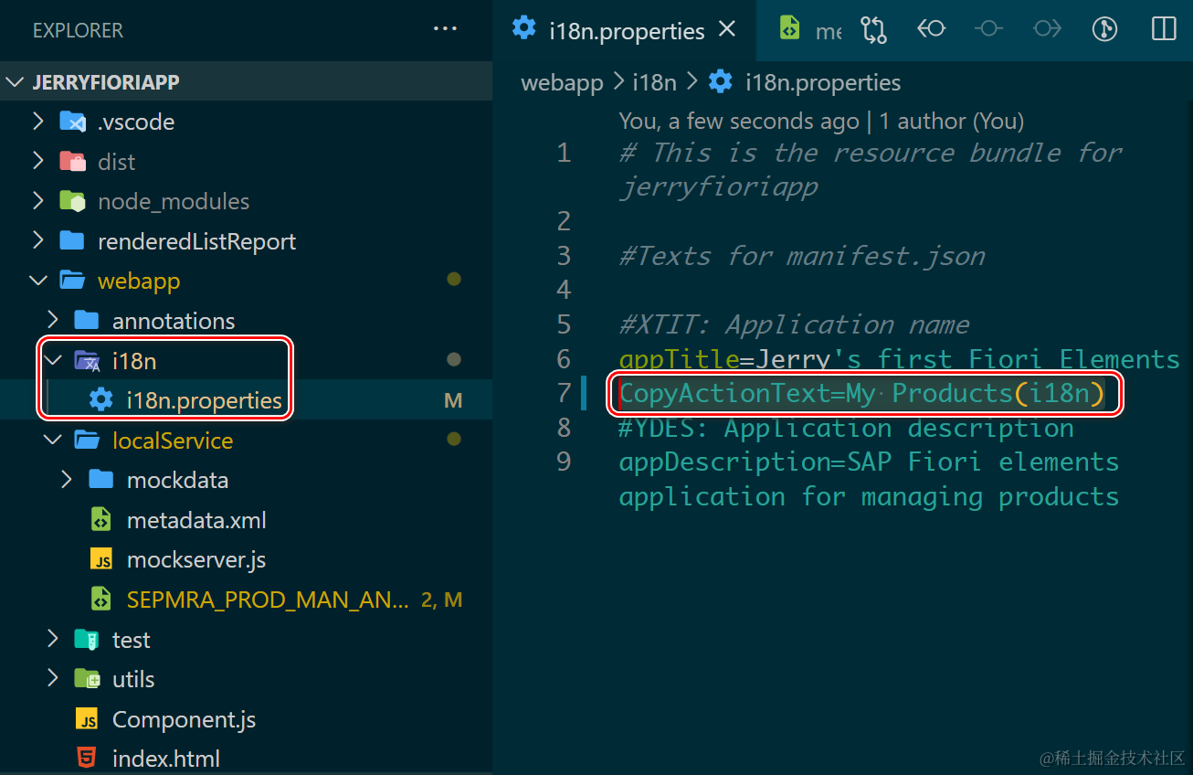 我在 SAP Fiori Elements 应用 i18n 文件夹的 i18n.properties 里,使用 key = value 的格式,定义一个 key 为 CopyActionText 的记录,内容为 My Products(i18n)