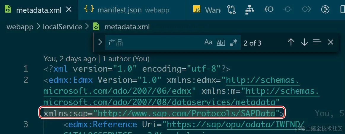 冒号之前的 sap 这一 xml 文件命名空间,定义在 xml 文件头部: