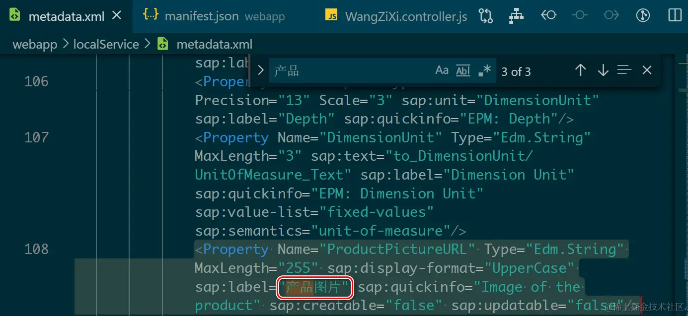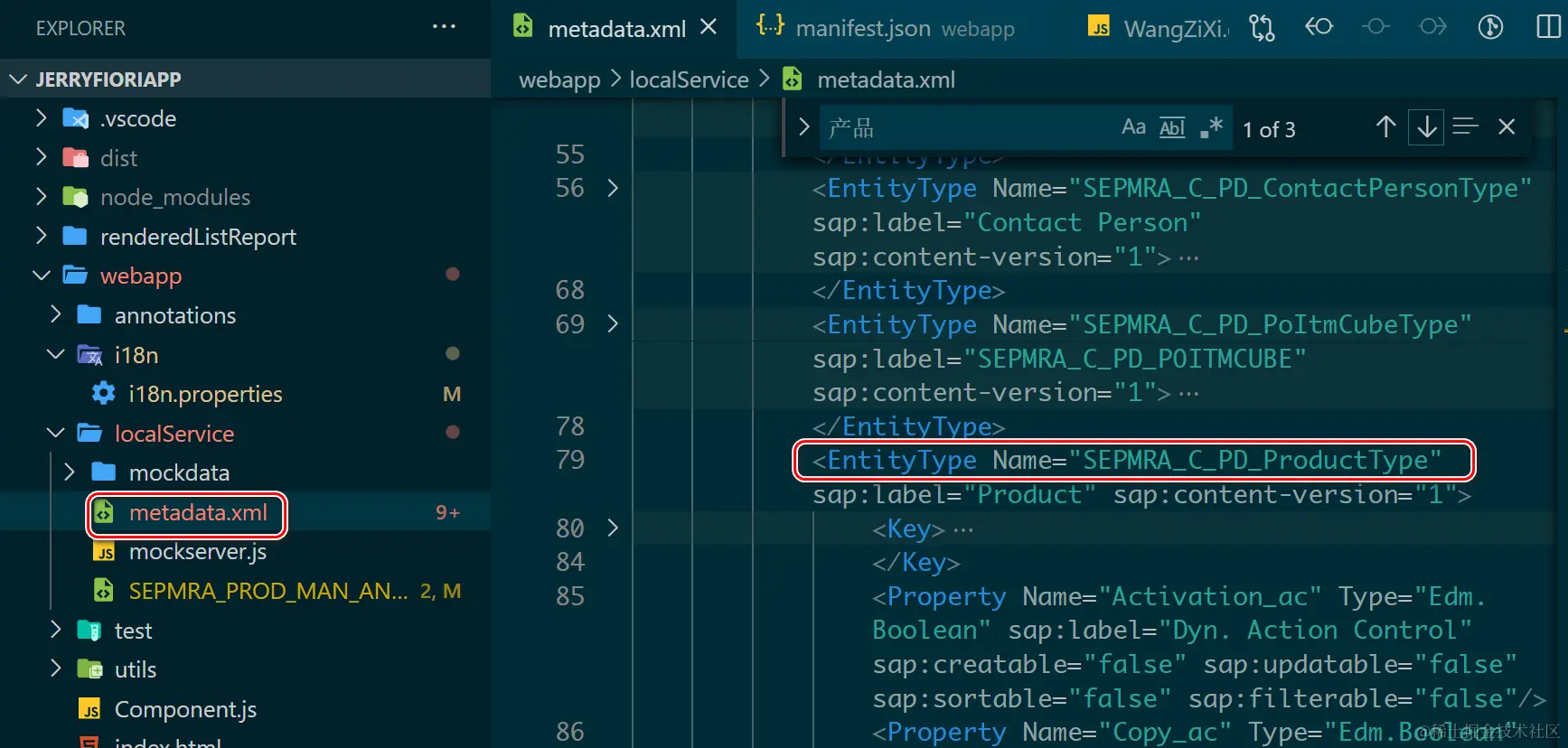 在项目工程文件里,找到 localService 文件夹下面的 metadata.xml, 定位到名为 SEPMRA_C_PD_ProductType 的 EntityType: