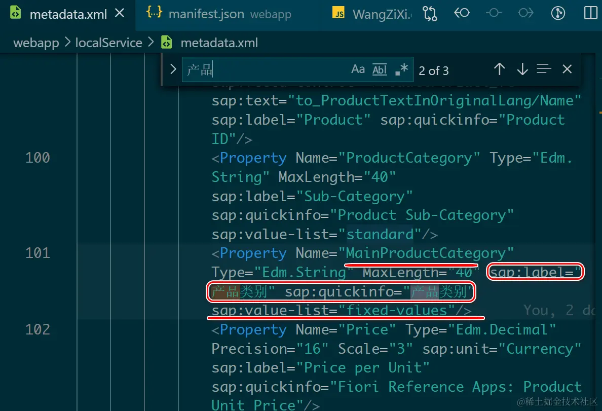在 本地元数据文件 metadata.xml 里,给 sap:label 的值维护成:产品类别。注意,sap:label 附近,就是另一个注解属性值:sap:value-list , 表明这个产品类别是一个下拉列表,且列表内的表项值固定。
