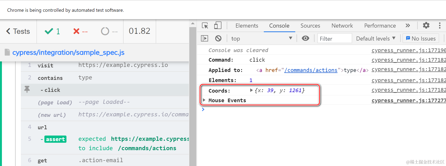 打开 Chrome 开发者工具,可以观察到 click 指令执行时的屏幕坐标,以及发生的鼠标事件: