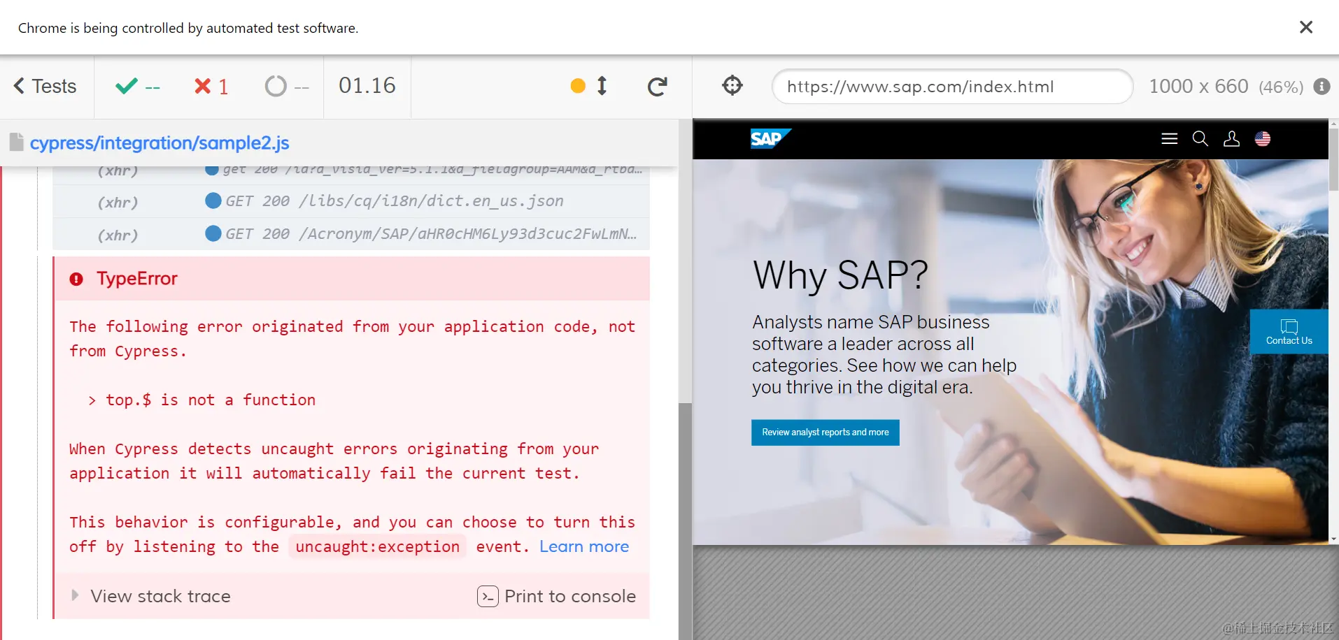 大意是,top.$ is not a function 这条错误消息,是 SAP 官网 www.sap.com 报出来的,而非 Cypress 本身。对于此类情况,一种选择是,我们可以在 Cypress 测试代码里通过异常捕获的方式,来忽略此类应用异常。