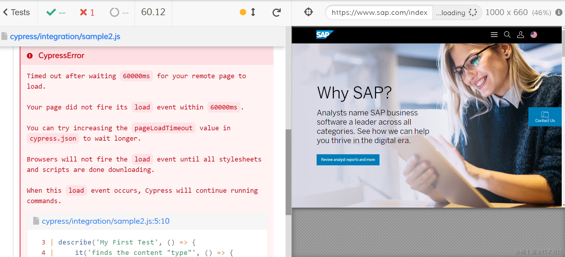 SAP 官网的首页,在试图被 cy.visit 指令加载后,在默认的 1 分钟 超时时间内,没有加载成功。