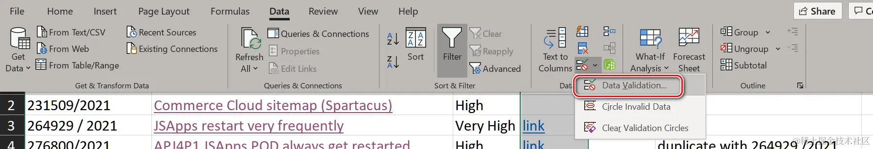 打开微软 Excel 365,选择 Data 标签,选择下图的 Data Validation 功能: