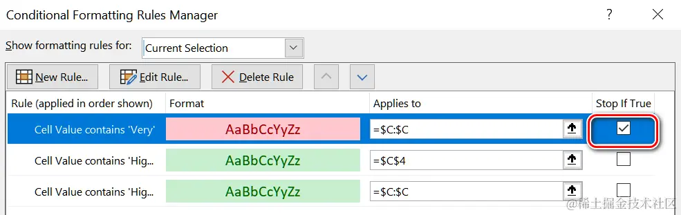 那么 Very High,同时满足这两条规则,但是 High -> 绿色的规则排在后面,所以 Very High 最后也显示成绿色,这不是我期望的结果,因此在下图 Very -> 红色规则的 Stop If True 打上勾。