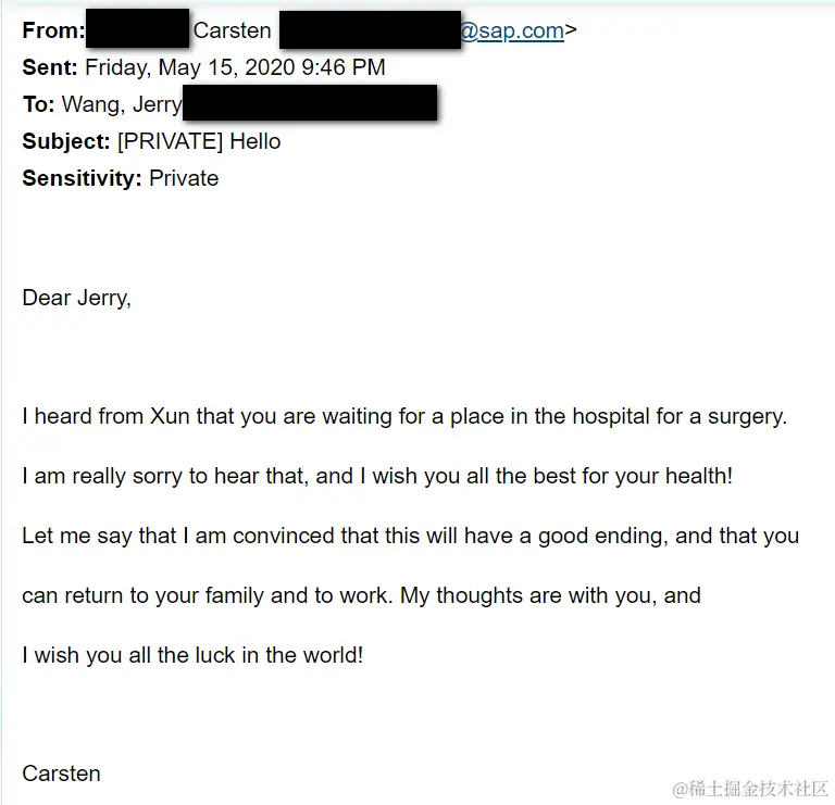 我每天在SAP的工作时长大致和我与家人相处的时长相当,SAP是另一个让我觉得很温暖的大家庭。感谢SAP大中华区和SAP海外的同事们在我生病期间通过微信,Slack和Outlook发给我的关心和问候。