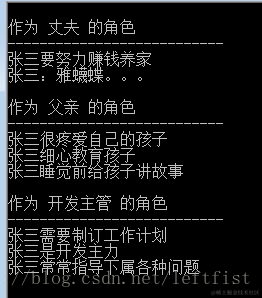 看到没?zhang3本身是一个完整的ItOldMan对象,继承了Person的基因,又实现了IHusband、IFather、IManager等多种接口,当Wife用IHusband调用它以后,Wife只会使用它IHusband的特性。