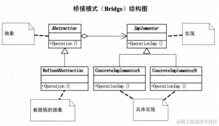 桥接模式由主体对象(抽象类)聚合各种具体实现类,从而扩展了功能,有点建造者模式的味道;实现方式为聚合。\