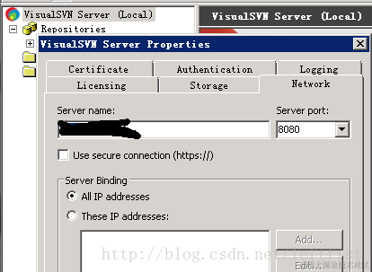 右击 VisualSVN Server(如图),设置访问端口。默认是80,https。