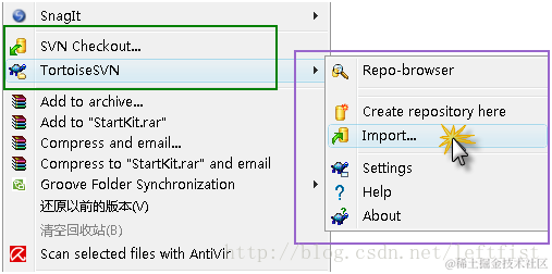 右击源代码目录,选Import,如图。通常源代码目录有许多并不需要提交的东西,如BIN目录,临时文件夹,等等,所以,import前,应该清洁源代码目录,保证里面的内容都是必须的。