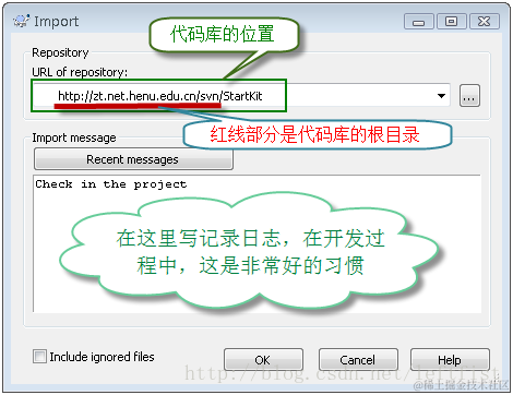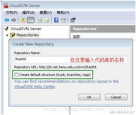 注意:上图中的CheckBox如果选中,则在代码库StartKit下面会创建trunk、branches、tags三个子目录;不选中,则只创建空的代码库StartKit。不选中,点击 OK创建。\