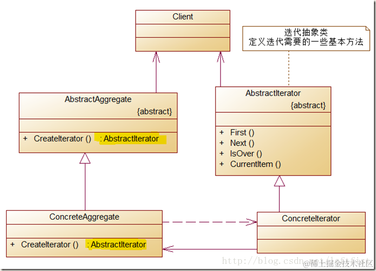 聚集器代表数据集合;迭代器用于访问聚集器里的数据。迭代器在聚集器类里面实现,类中类的方式。