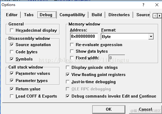 3、再将Tools->Options中的Debug,Disassembly window下的Source annotation勾上(这步可做可不做)。