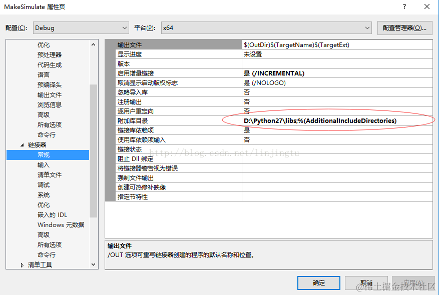 或者把D:\python3.4.2\libs放进项目 > 属性 > 配置属性 > 链接器 > 常规 > 附加库目录中。