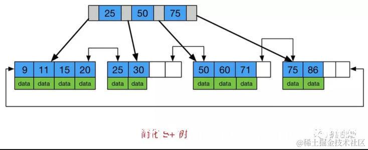 B+树是B-树的变种。不同的是,数据散落在B-树的所有结点上,而B+树则是,位于非叶结点上的数据,在叶子结点上也会有一份。比如说,数据52,在B-树位于根节点,那么它在叶子结点上就没有;但在B+树,它在某个叶子结点上也会存在。就是说,B+树的叶子结点,有全部的数据。